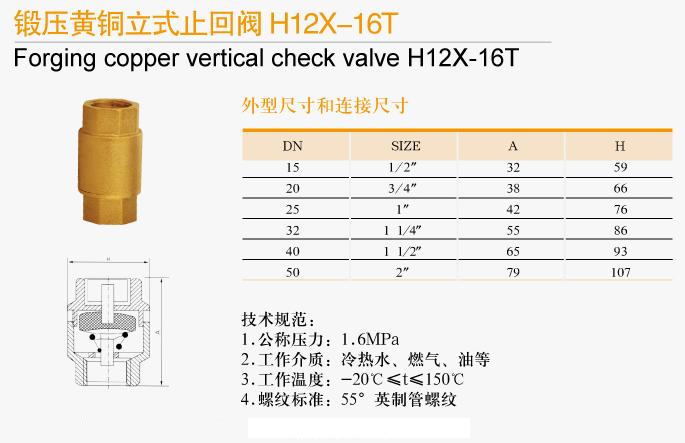 鍛壓黃銅立式止回閥H12X-16T技術規范: